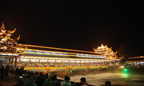 都江堰南橋位于都江堰寶瓶口下側(cè)的岷江內(nèi)江上,是南街與復(fù)興街之間的一座雄偉壯麗的廊式古橋。清光緒四年(1878),縣令陸葆德用丁寶楨大修都江堰的結(jié)余銀兩設(shè)計(jì)施工,建成木橋,名“普濟(jì)橋”。1925年重建,橋面加寬。1933年,毗河戰(zhàn)爭(zhēng)爆發(fā),木橋中孔被拆毀,戰(zhàn)后修復(fù)時(shí),增建了寨門。橋長(zhǎng)約133米,4排5孔,白天開放,晚上關(guān)閉。1958年,橋毀于洪水,重建時(shí)改木橋樁為混凝土橋墩,增建了牌坊形橋門,仍為5孔,長(zhǎng)45米,寬10米,正式定名為"南橋"。1979年改建,加高了橋身和通道,仍5孔。橋身為木梁鋼筋水泥柱,混凝土橋面,橋頭增建了橋亭、石階、花圃,橋身雕梁畫棟,橋廊增飾詩畫匾聯(lián)。不僅保持了古橋風(fēng)貌,而且建筑藝術(shù)十分考究,是都江堰市一處旅游勝景。