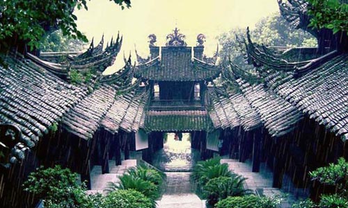 始建于清乾隆年間,是一座封建世俗性很強(qiáng)的廟宇。廟宇設(shè)計(jì),風(fēng)格獨(dú)特,依山取勢(shì),依坡形地勢(shì)建筑,結(jié)構(gòu)極為謹(jǐn)嚴(yán)奇巧。清華大學(xué)建筑系師生來此考察后,認(rèn)為這是富有道家哲學(xué)思想的道教古建筑。自下仰望,建筑群分為上下兩區(qū),呈丁字形。登百余級(jí)石階,進(jìn)頭道山門,兩旁為“十殿”。在一條30余米長(zhǎng)的上行梯道兩側(cè),呈對(duì)稱跌落布局。每殿相鄰,可見層層飛檐,如入云霄,有一種森嚴(yán)神奇之感。有蜀中“鬼城”之稱。